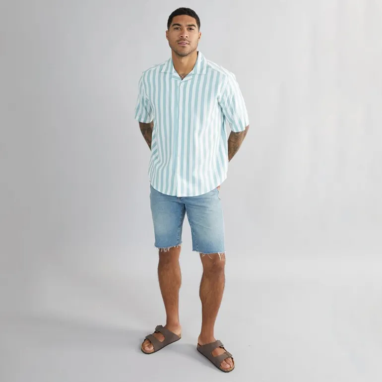 ONLY & SONS Herre Tes Relax Bomuld Slub Stribet Kortærmet Skjorte Seaspray Stribet