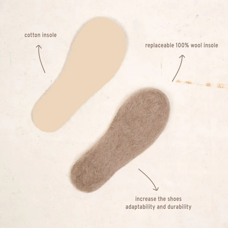 - Udskiftelige indlægssåler inkluderet i uld og bomuld. Indlægssåler kan nemt fjernes og lufttørres separat, når det er nødvendigt.